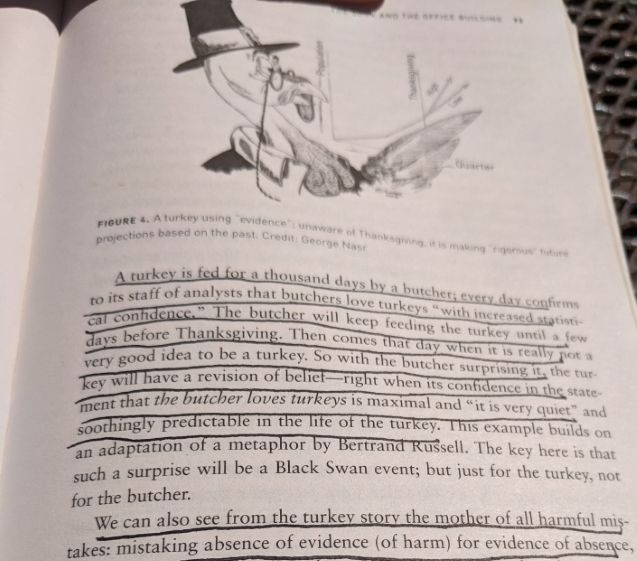 - Absence of evidence isn’t evidence of absence. This where the title of Taleb’s The Black Swan comes from. Europeans used to think all swans were white. Then in 1697 two Dutch explorers discovered black swans in Australia. Only seeing white swans didn’t mean all swans were white. Another example: a turkey will mistake being well fed all year for evidence of a great life, only to be surprised a few weeks before Thanksgiving. Asking “what’s the next black swan event?” ignores their main feature: black swans are not predictable.