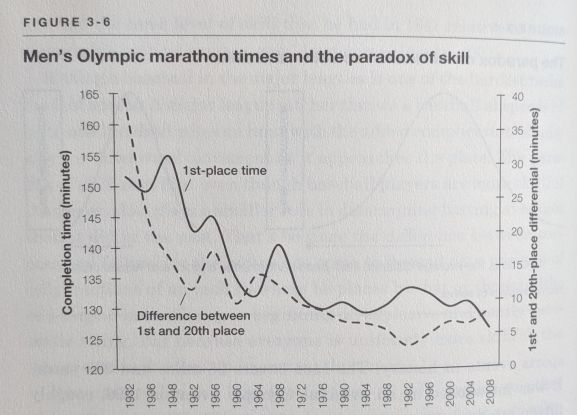 The paradox of skill is that greater competition increases the importance of luck. People get better at doing something, performance becomes more consistent, and luck gains importance as the difference shrinks between top performers.