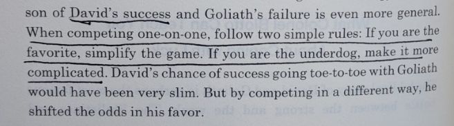 Alter strategy based on your standing. David beat Goliath with a slingshot – not strength. If you’re the underdog, you have to think outside the box. If you have a clear advantage, isolate the game to your edge. Small countries have increasingly won wars against larger powers by shifting strategy and refusing to engage strong countries where they have an advantage.