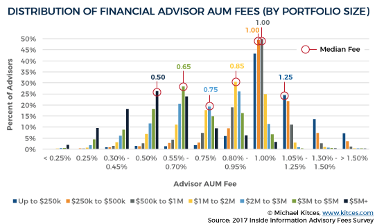 The median annual fee to manage $1 million is 1.0% per year. This is a bit above the 0.85% that Michael Kitces found:
