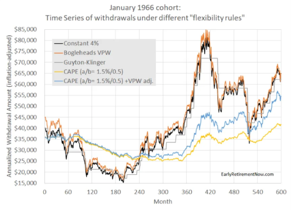 For example, the graph below shows the inflation-adjusted withdrawals of a 1966 retiree. The orange and grey lines show that these strategies led to a 60% decrease in withdrawals: