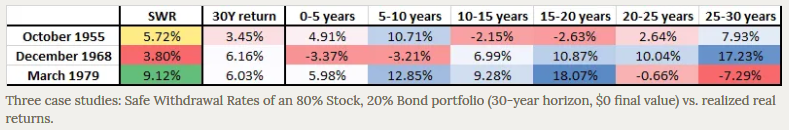 The table below shows the compound return and sequence of those returns for hypothetical 30-year retirements starting in 1955, 1968, and 1979. The left-most column shows the safe withdrawal rate, or the initial percentage an investor could have withdrawn without running out of money.