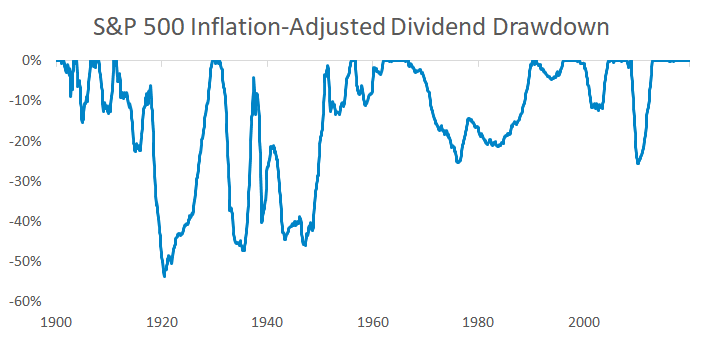 Stock dividends are volatile and have experienced multi-decade drawdowns: