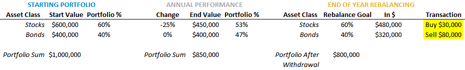 I should note that a cash reserve is not the only way to avoid selling investments when they drop. Regular rebalancing does the same thing. The example below shows how a 60/40 investor needing to withdraw $50,000 would avoid selling stocks if they fell: