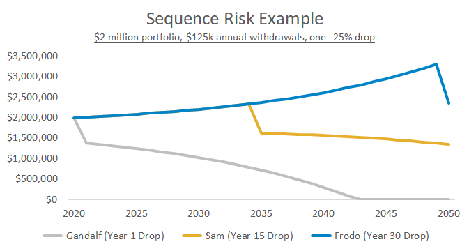 Take three investors that start with $2 million, earn identical 7% annual returns, and withdraw $125k per year. The only difference is that they incur a 25% loss at different times:
