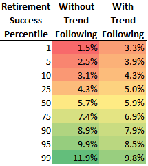 The table below shows safe withdrawal rates for a 30-year retirement with a 50/50 portfolio of stocks and bonds. In the scenarios commonly used to stress test retirement viability (the 5th and 10th percentiles), trend following resulted in higher safe withdrawal rates.