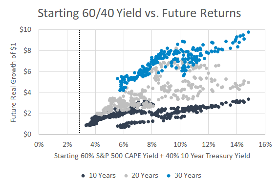 The graph below shows the relationship between starting valuations and yields (x-axis) compared to future returns (y-axis) of a portfolio 60% in U.S. stocks and 40% in 10-year Treasury bonds.