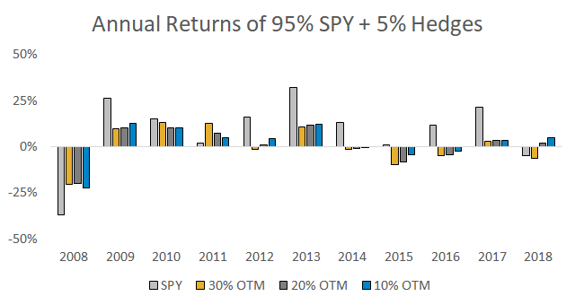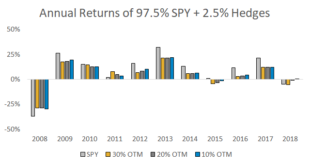 The chart below shows the differences in annual performance between the 2.5% hedge structures and a 100% long position in SPY.