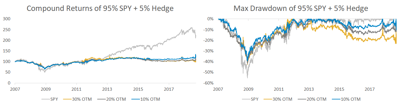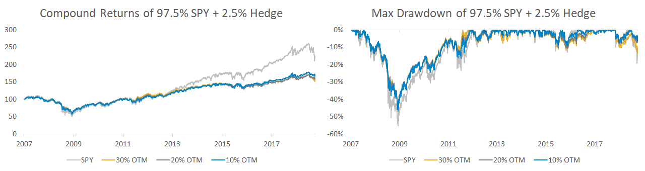 The first graphs show the compound return and max drawdown for a 2.5% allocation to the three structures. This 2.5% is reset every quarterly roll. For example, if at the end of a quarter the SPY allocation drifts to 99.0% and the hedge is 1.0%, the percentages are rebalanced to 97.5% and 2.5%.