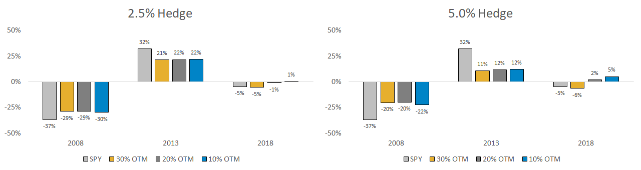 2008 was the ultimate year to have a hedge, 2013 was the opposite with SPY rising more than 30%, and 2018 was an in-between year with substantial volatility but only mildly negative SPY performance. Here’s how each structure and budget did in those years.