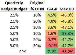 Seemingly small hedge amounts can translate to drastic underperformance in strong markets. Especially if a year is a steady grind higher like 2013. A 5.0% hedge budget in 2013 was evaporated each quarter, translating to a cumulative -20% annual drag compared to a 100% SPY position.