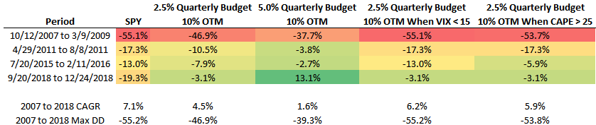 A larger 5.0% hedge budget resulted in smaller losses, but at the expense of dismal full cycle performance. The VIX and CAPE filters did improve returns relative to a constant hedge, but they both failed to protect investors from losses in 2008 and 2011.